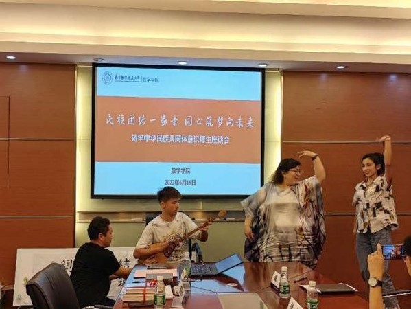 活动的最后,h韩漫 2021级少数民族预科班的阿核卓乐·巴合提同学为老师们弹奏了一曲冬不拉,现场的老师同学们闻歌起舞,气氛达到高潮,座谈会在美妙的歌舞声中活动圆满结束。