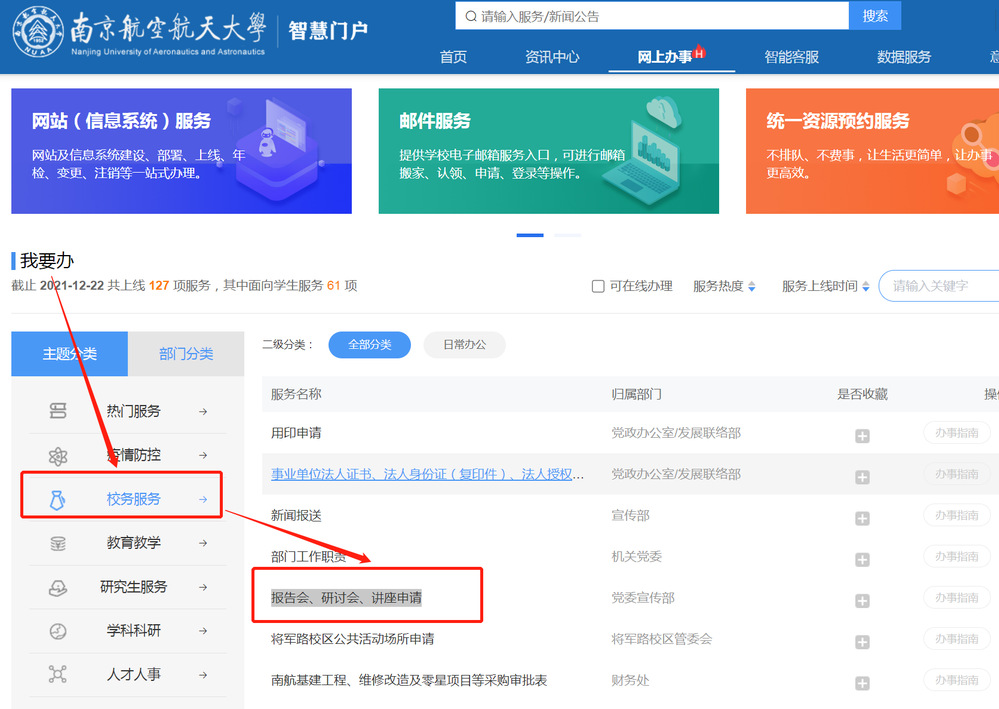 1. 登录学校智慧门户-网上办事大厅,网址://i.hanmangah.com/web/onlineService/,在“我要办”栏目版块选择“校务服务”,然后选择“报告会、研讨会、讲座申请”事项。
