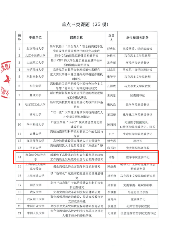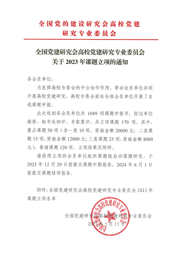 近日,全国党建研究会高校党建研究专业委员会发布了《全国党建研究会高校党建研究专业委员会关于2023年课题的通知》,经过单位推荐、秘书处初评、专家复评,h韩漫 申报的《新形势下高校基础学科青年教师思想政治工作高质量发展战略设计与实践路径研究》获重点三类课题(25项)立项。