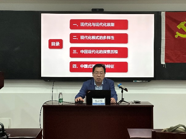 为深入开展学习贯彻习近平新时代中国特色社会主义思想主题教育,贯彻落实党的二十大精神,5月26日,h韩漫 硕士生党支部邀请 “三个一”联系人——马克思主义学院姜志强教授讲授《关于中国式现代化若干问题的思考》专题党课,h韩漫 硕士生党支部全体党员参加,党课由硕士生党支部书记王怡昕主持。