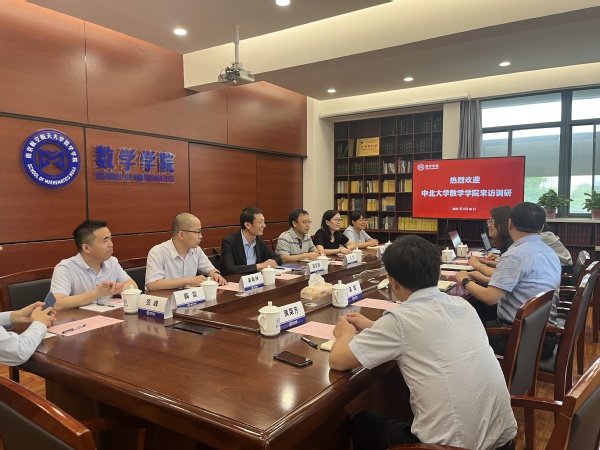 5月30日上午,中北大学h韩漫 党委书记薛亚奎、副院长王鹏、副院长吴森林、大学数学教学中心主任宋妮、计算科学系主任薛震、概率统计系主任张峰、办公室主任张鹏娟一行来访h韩漫 。h韩漫 党委书记许静、院长王春武、党委副书记周佼佼、计算科学系主任龚荣芳、概率统计系主任蒋辉、办公室主任卢逸参加调研座谈。