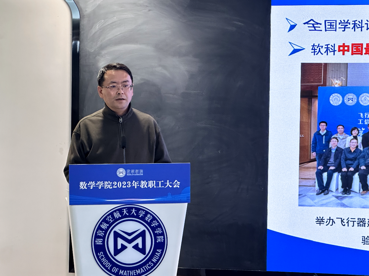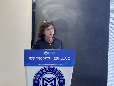 许静代表学院党委从政治建设、思想建设、组织建设、作风建设、纪律建设等方面作《2023年度学院全面从严治党工作总结》报告。她指出在学校党委的坚强领导和全体师生共同奋进下,学院将高质量落实主题教育作为首要政治任务和工作主线,厚基础、重质量、强特色,把牢理论武装“支撑点”,锚定卓越理科“中心点”,聚焦立德树人“关键点”,找准凝心聚力“着力点”,以“融智、融力、融创、融心”四融党建赋能学院各项事业高质量发展,并取得了阶段性成效。下一阶段学院将紧扣“高质量”和“特色化”,持续推进党建业务深度融合,力争引领各项事业取得新突破、新跨越。