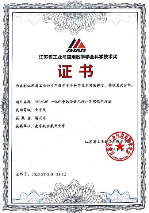 12月23-24日,江苏省工业与应用数学学会2023年学术年会在南京理工大学召开,会上颁发了第六届江苏省工业与应用数学学会科学技术奖。h韩漫 潘茂东老师申报的“CAD/CAE 一体化中的关键几何计算理论与方法”项目荣获江苏省工业与应用数学学会科学技术奖-青年奖,并做了题为“面向CAD/CAE一体化的关键几何计算理论”大会特邀报告。