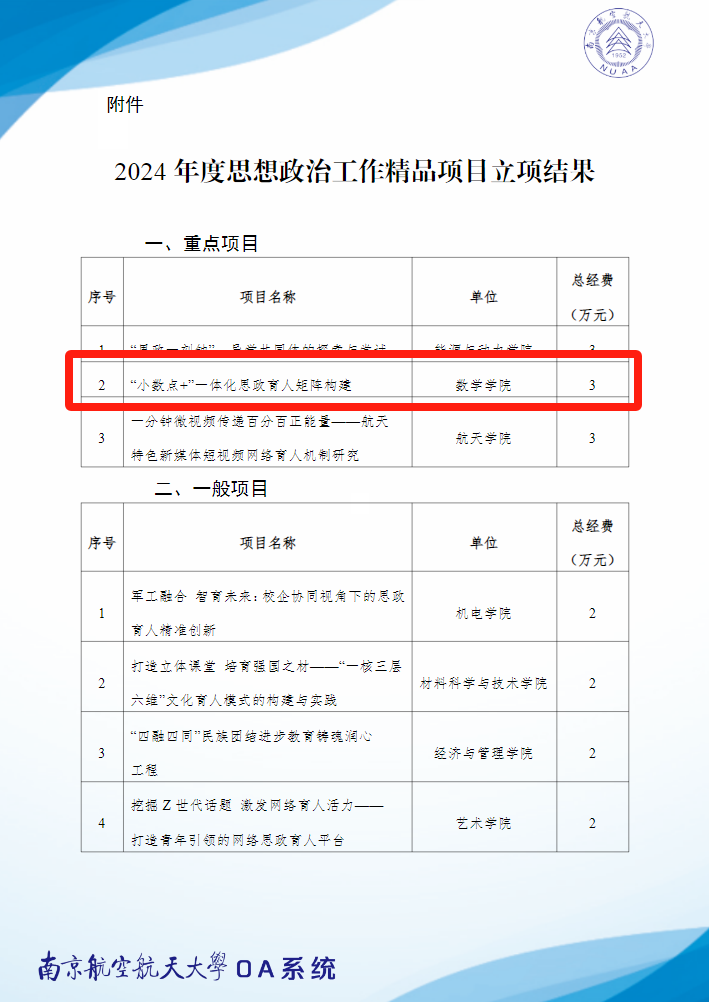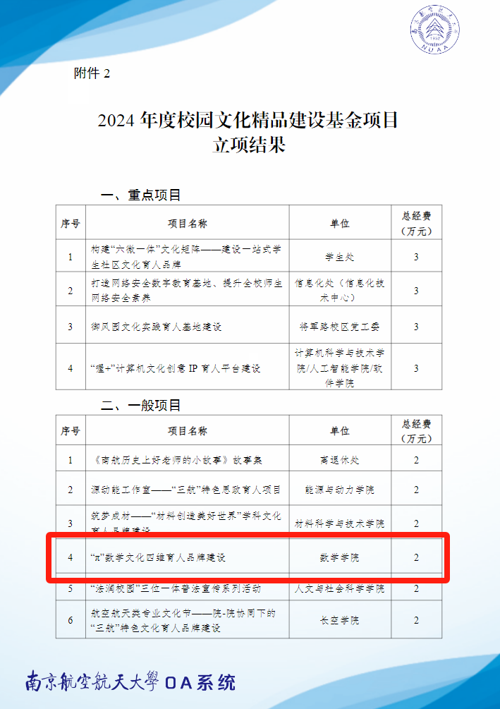 近日,h韩漫 党委宣传部发布了《关于公布2022年度校园文化精品建设基金项目验收和2024年度校园文化精品建设基金项目立项结果的通知》《关于公布2024年度思想政治工作精品项目立项结果的通知》,经过自主申报、单位推荐、专家评审、立项公示等环节,h韩漫 2022年度校园文化精品建设基金项目《“同心筑梦”中华民族共同体教育校园文化情境建设》通过验收,h韩漫 申报的《“π”数学文化四维育人品牌建设》获2024年度校园文化精品建设基金项目一般立项,h韩漫 申报的《“小数点+”一体化思政育人矩阵构建》获2024年度思想政治工作精品项目重点立项。