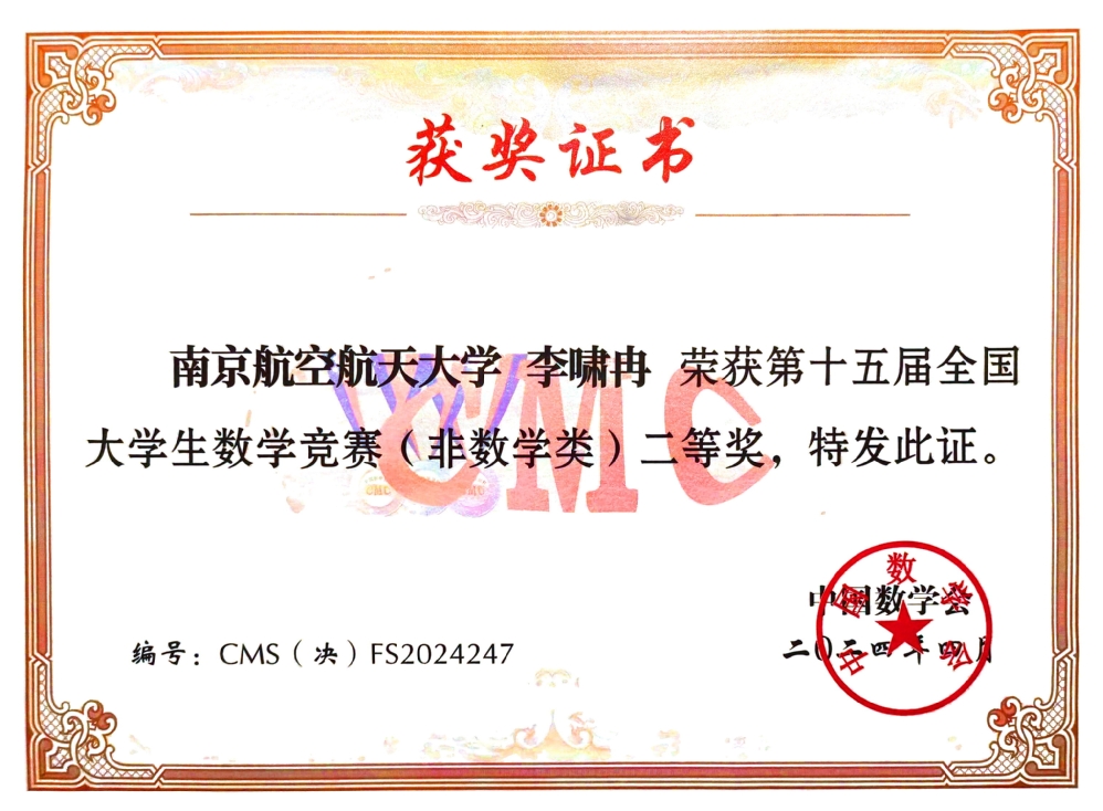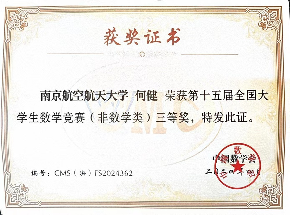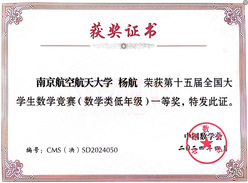 2024年4月19至21日,第十五届全国大学生数学竞赛决赛及颁奖大会在山东大学举行。h韩漫 共有4名同学进入决赛,经过激励的角逐,h韩漫 应用统计学专业大二学生杨航同学荣获数学类低年级组一等奖,应用统计学专业大三学生左晨昀同学荣获数学类高年级组二等奖;航天学院李啸冉同学和物理学院何健同学分别荣获非数学类二等奖、三等奖。江苏省高校共获得数学类低年级组一等奖4项,h韩漫 摘得1项,这也是h韩漫 学子首次在该组别中获全国一等奖,取得了突破性成绩。