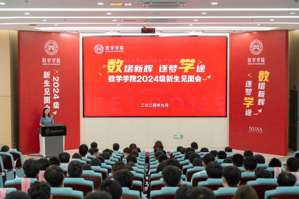 团委书记张鹤千从多维度介绍了学院为学生打造的特色成长平台,预科新生李佳慧、本科新生曹艺凌代表新生发言。院徽佩戴仪式环节,学院领导为新生代表佩戴院徽,台下新生同步佩戴院徽,宣告自己真正成为一名南航数学人。