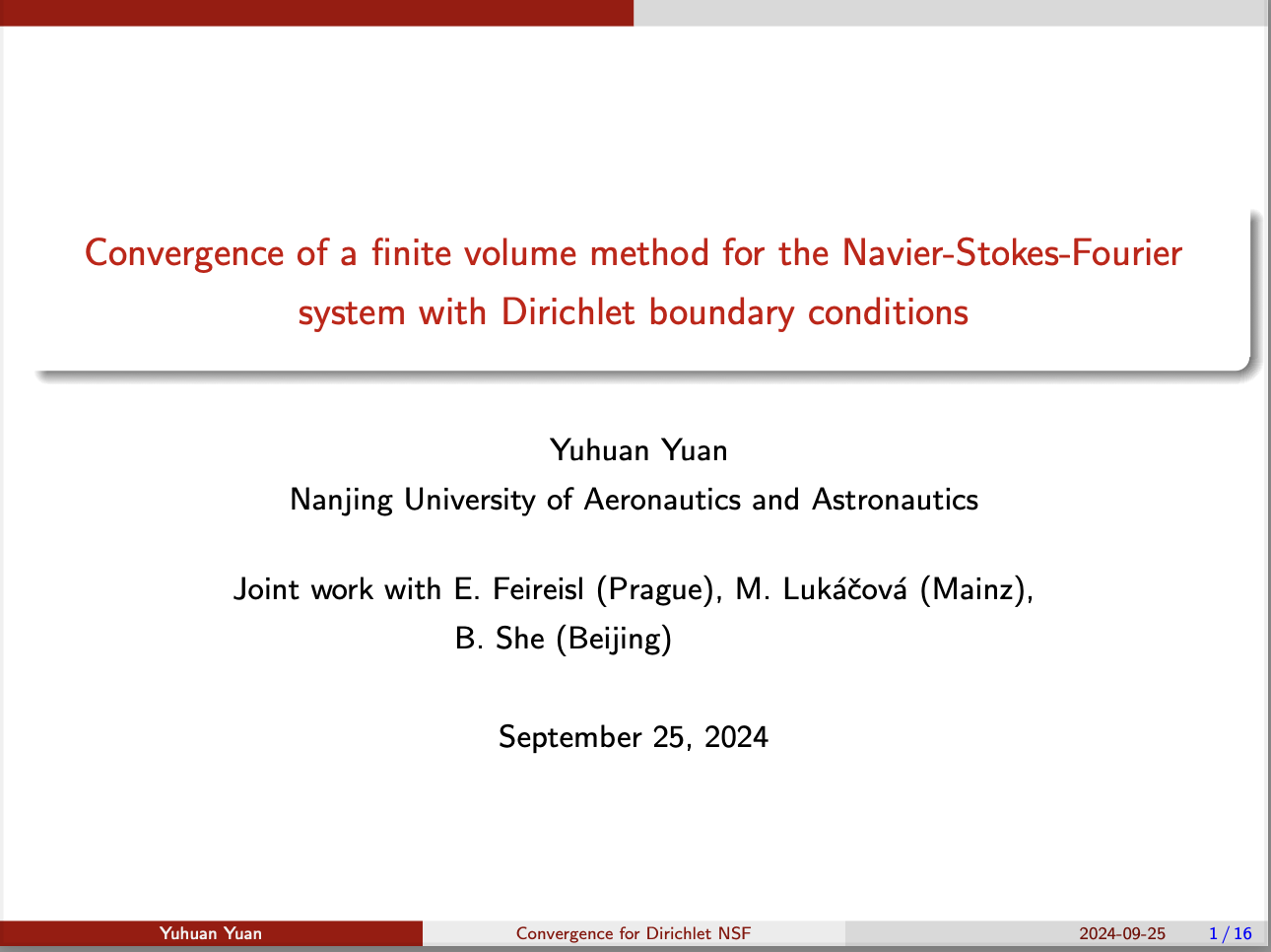 袁玉环首先简单分享了自己在北京大学求学和(德国)美茵茨大学工作时的科研兴趣,随后介绍了近期的科研工作。她通过著名的Rayleigh-Benard对流现象引入NSF的Dirichlet问题,而后介绍了相关的国内外数学和数值分析结果,指出当下该问题数值收敛性的研究很大程度上还是空白的。接着她详细讲解了一阶有限体积方法的构造,并通过对比周期问题指出Dirichlet问题数值分析的重点和难点,最后介绍了得到的数值分析结果,包括数值解的保结构(保密度温度为正、保弹道能量稳定)、数值解有界假设下的一致估计、相容性和收敛性结果。