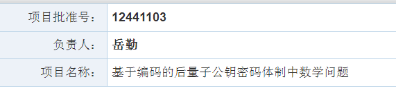 岳勤教授成功获批资助项目1项(项目名称:基于编码的后量子公钥密码中数学问题),直接经费164万元。至此,学院本年度国家自然科学基金立项总数达11项,其中重点项目1项,百万级重点专项项目1项,标志性科研项目取得重要突破。