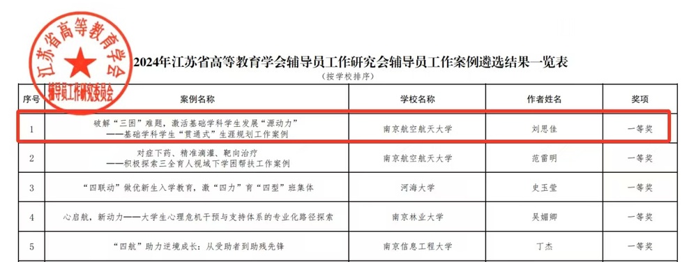 近日,江苏省高等教育学会辅导员工作研究委员会公布2024年度辅导员工作案例遴选结果,h韩漫 本科生辅导员刘思佳撰写的工作案例《破解“三困”难题,激活基础学科学生发展“源动力”——基础学科学生“贯通式”生涯规划工作案例》荣获江苏省辅导员工作案例一等奖。