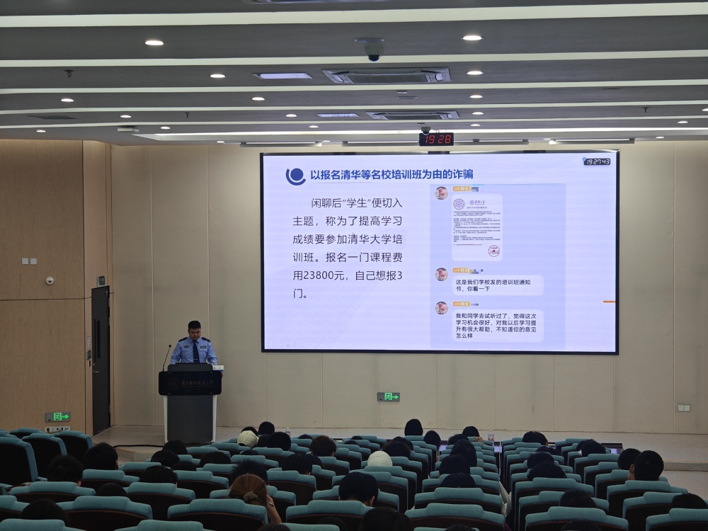 为有效提升学生对电信网络诈骗的识别和防范能力,营造安全和谐的校园环境,5月14日晚,h韩漫 在天目湖校区牧星楼T2110教室举办“天目护航”防诈安全教育专题讲座。古县派出所民警兼h韩漫 法制辅导员鲍力主讲,学院党委副书记王亚鹏、2024级辅导员赵美婷、迪丽以及2024级全体本、预科生到场参加。