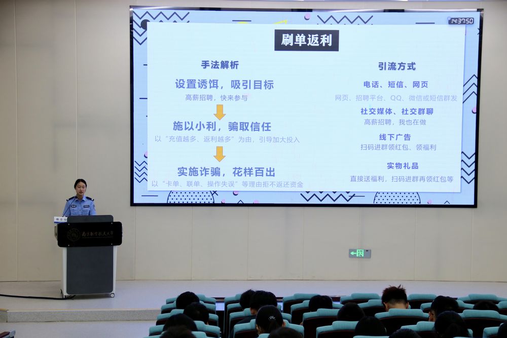 为进一步增强全体师生的安全防范意识,提高反诈骗能力,9月26日,h韩漫 在天目湖校区牧星楼T2108报告厅举办防电诈安全教育专题讲座。本次讲座特邀溧阳市古县派出所滕若兮警官以防范诈骗为主题,为师生讲解反诈安全知识。全体2024级本科生、2025级少数民族预科生到场聆听学习。